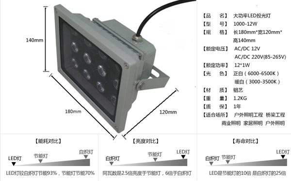 名称:12WLED投光灯 【输入电压】,220V DC 【输入功率】,3W 【LED数量】,1颗大功率封装LED,30瓦 【灯体材质】,铝合金 【整灯功率】,30瓦 【发光颜色】,暖白,正白 【防水等级】,IP65防水 【理论寿命】,50 000小时