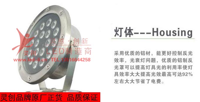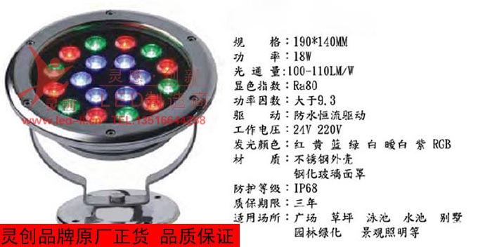 产品名称: 12V18W水底灯 LED低压水下灯 水池灯 喷水池景观灯 芯片:进口高流明晶圆 驱动电源:性能稳定恒流源 产品尺寸:∮175*210MM 功率:18W 灯光颜色:正白暖白红绿蓝黄七彩 照射角度:5°-120° 材质工艺:不锈钢电镀、灌胶 防水等级:IP68