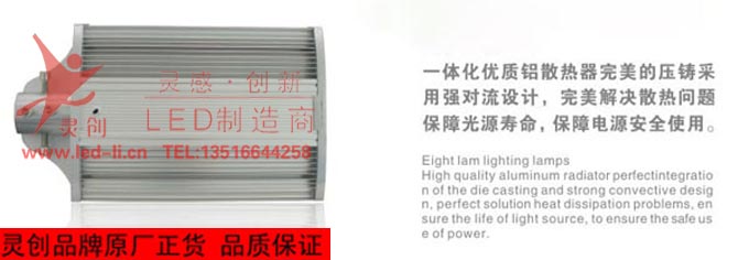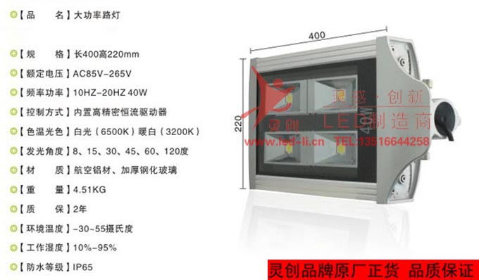 【产品】:LED路灯头/LED路灯/户外射灯 【材料】:压铸铝件+灯珠支架光杯+钢化玻璃板盖 【色温】:暖白光/正白光(购买时请注明需要的色温) 【电压】:220V(灯体外置恒流驱动电源) 【芯片】:台湾原装进口LED芯片,寿命五万小时以上